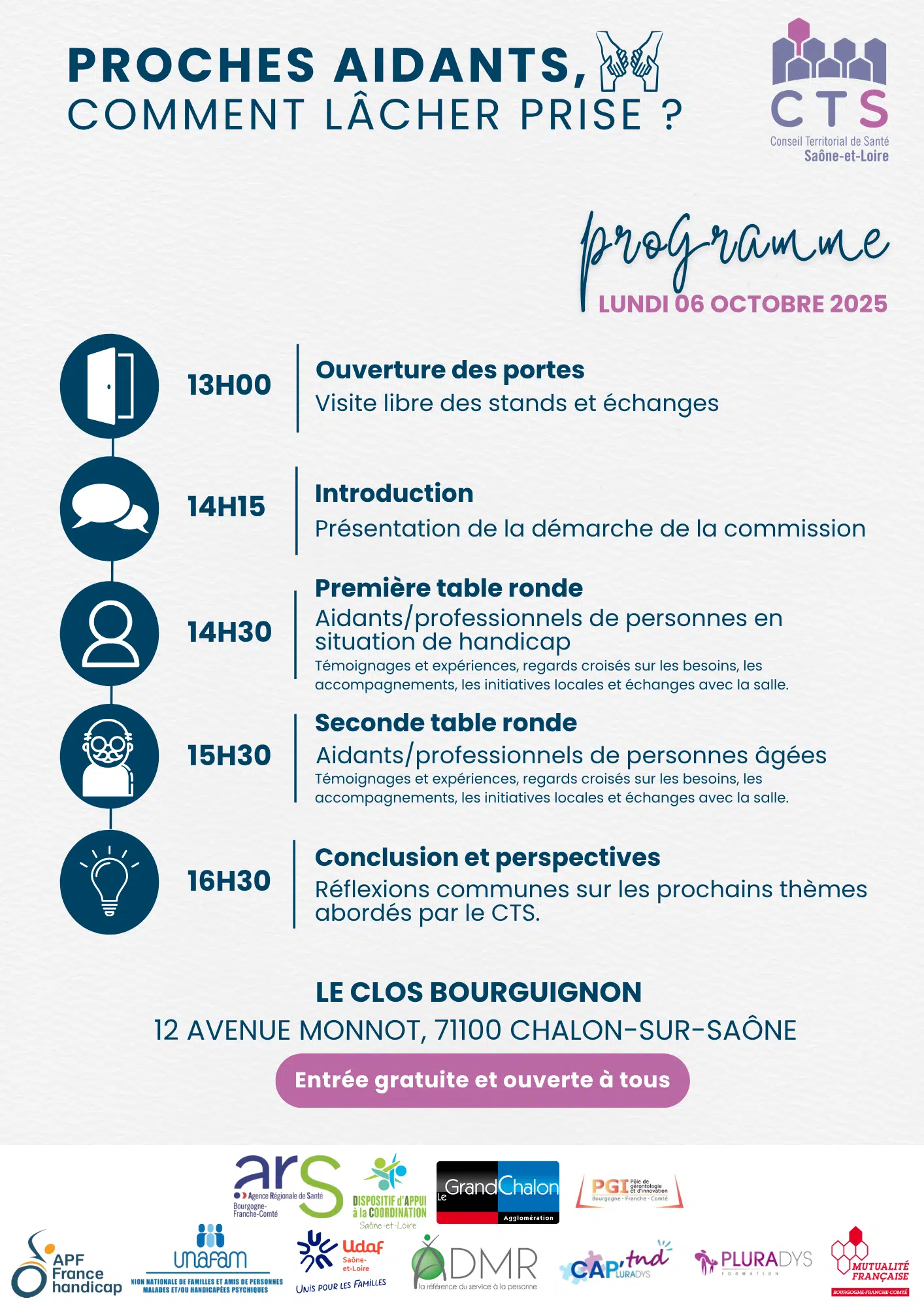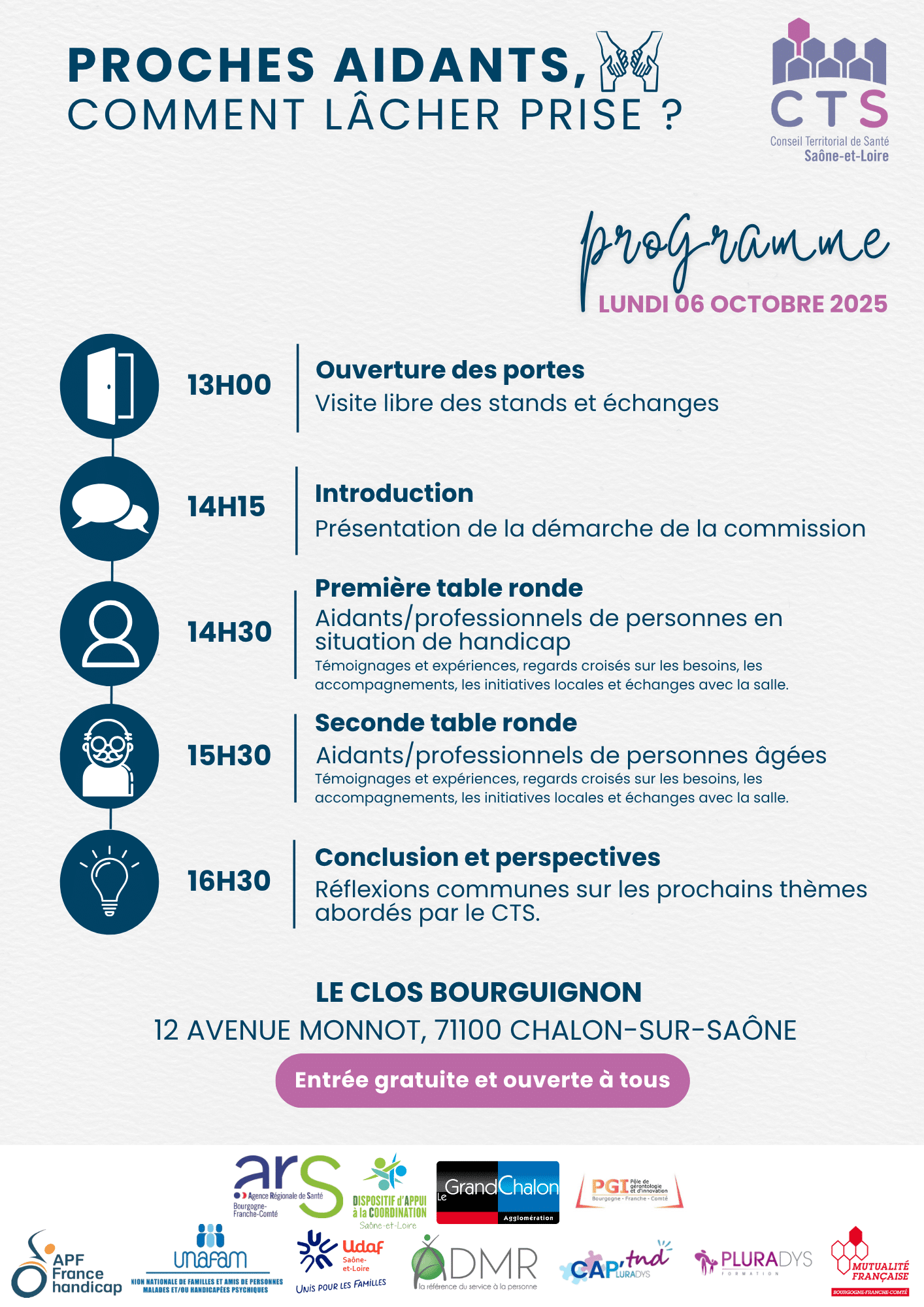 À l’occasion de la Journée nationale des aidants, la Commission des usagers du Conseil Territorial de Santé 71 vous invite à une après-midi d’échanges et de partage :