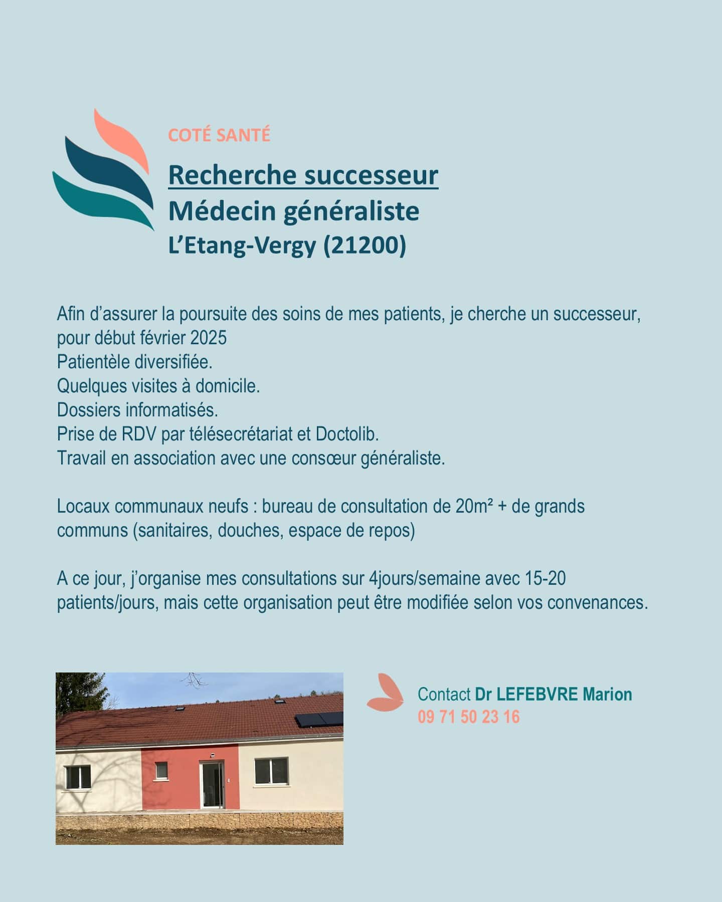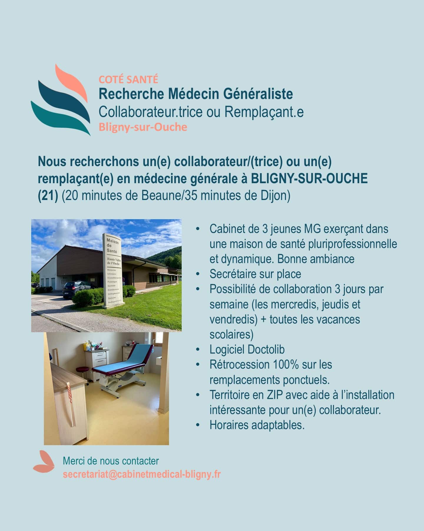 Si vous aussi, vous recherchez un collaborateur ou remplaçant, n’hésitez pas à contacter notre coordonnatrice au 07 86 09 10 37 ou coordination@cpts-sudcotedor.fr
