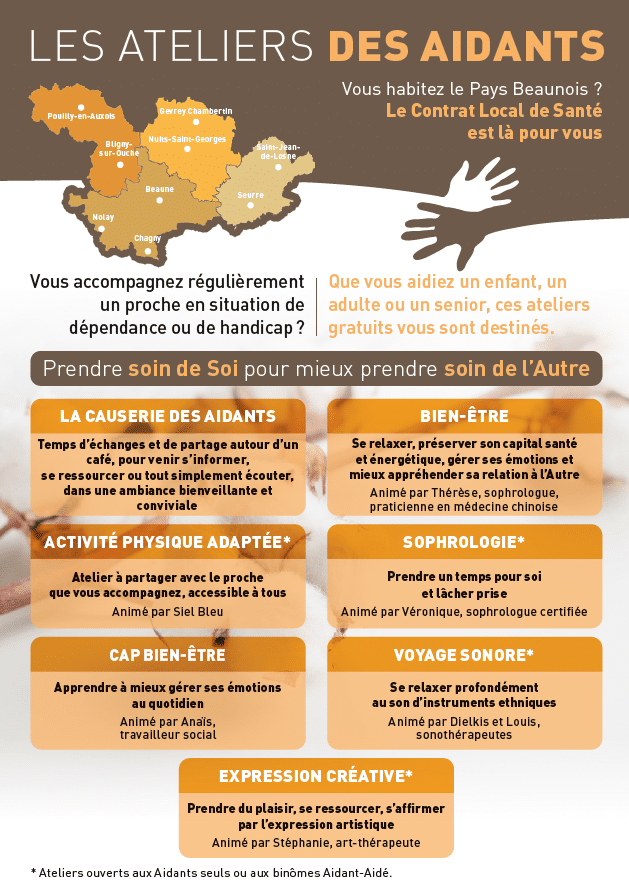 𝐏𝐫𝐨𝐩𝐨𝐬𝐞́𝐬 𝐚̀ 𝐁𝐄𝐀𝐔𝐍𝐄, 𝐍𝐔𝐈𝐓𝐒-𝐒𝐀𝐈𝐍𝐓-𝐆𝐄𝐎𝐑𝐆𝐄𝐒 𝐞𝐭 𝐝𝐞́𝐬𝐨𝐫𝐦𝐚𝐢𝐬 𝐂𝐇𝐀𝐆𝐍𝐘, ces ateliers sont accessibles à tout habitant du Pays Beaunois (soit 194 communes du Sud Côte-d’Or et du Nord Saône-et-Loire) accompagnant un proche en situation de dépendance, que cette dépendance soit liée à l’avancée en âge, à la maladie ou au handicap, sans condition d’âge et que le proche en question réside à son domicile ou en institution.