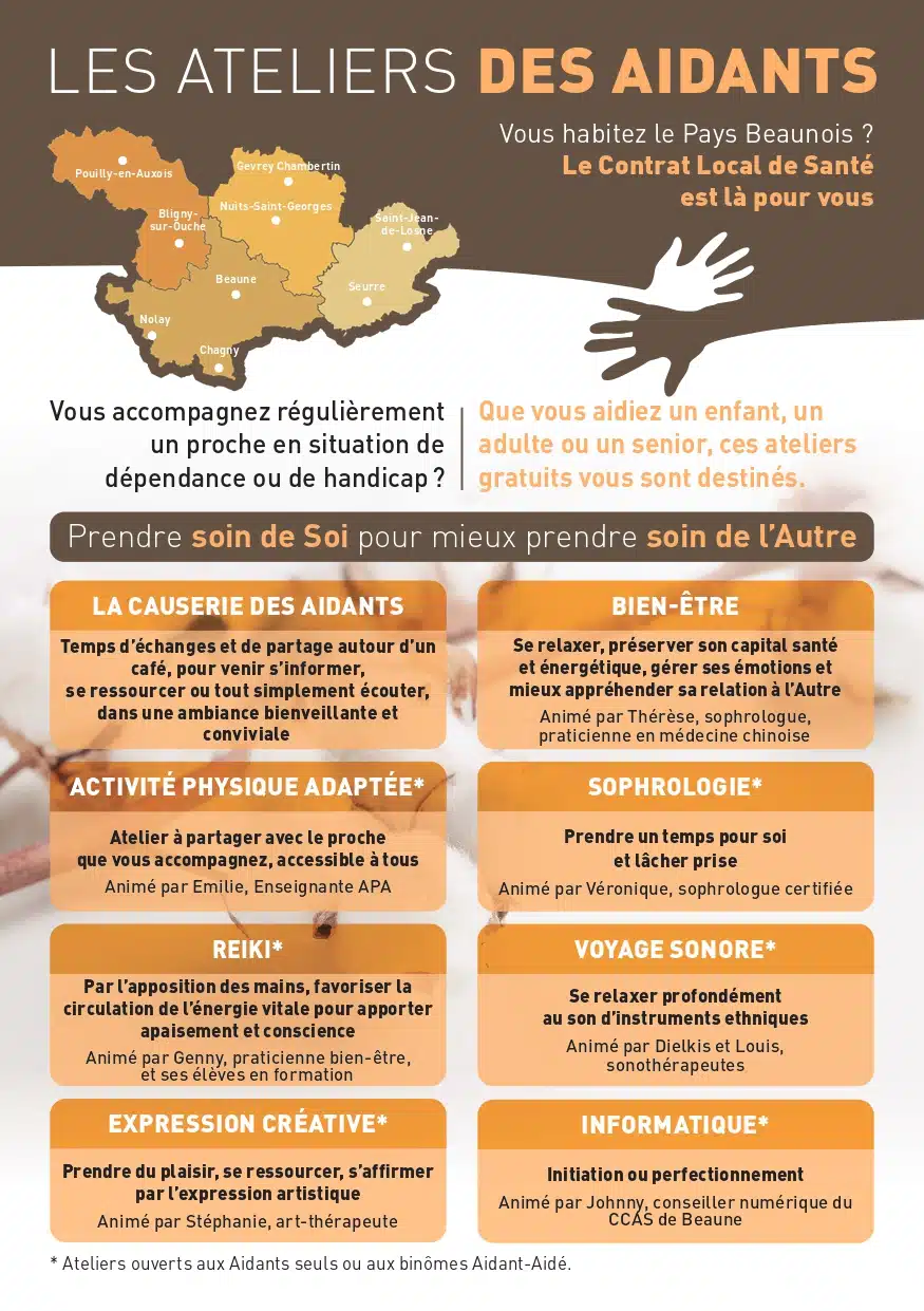 𝐏𝐫𝐨𝐩𝐨𝐬𝐞́𝐬 𝐚̀ 𝐁𝐄𝐀𝐔𝐍𝐄, 𝐍𝐔𝐈𝐓𝐒-𝐒𝐀𝐈𝐍𝐓-𝐆𝐄𝐎𝐑𝐆𝐄𝐒 𝐞𝐭 𝐝𝐞́𝐬𝐨𝐫𝐦𝐚𝐢𝐬 𝐂𝐇𝐀𝐆𝐍𝐘, ces ateliers sont accessibles à tout habitant du Pays Beaunois (soit 194 communes du Sud Côte-d’Or et du Nord Saône-et-Loire) accompagnant un proche en situation de dépendance, que cette dépendance soit liée à l’avancée en âge, à la maladie ou au handicap, sans condition d’âge et que le proche en question réside à son domicile ou en institution.